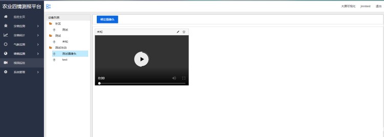 监控主页显示设备列表、大屏可视化、地图展示等菜单信息。显示土壤墒情、虫情、气象监测图标及设备的运行状态。